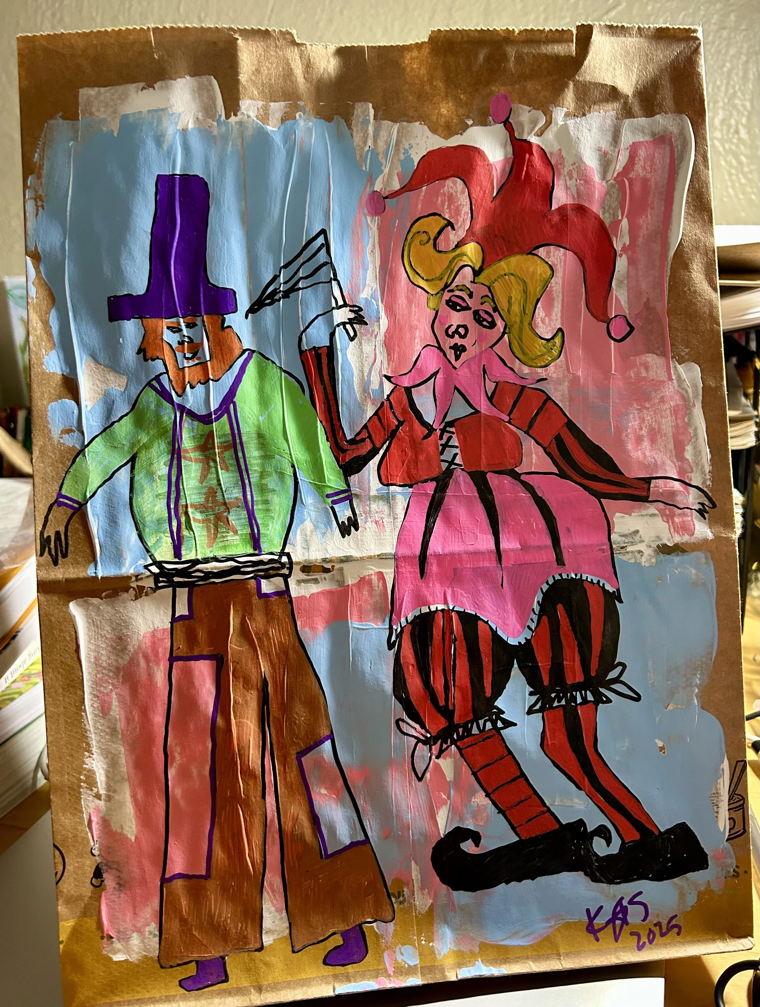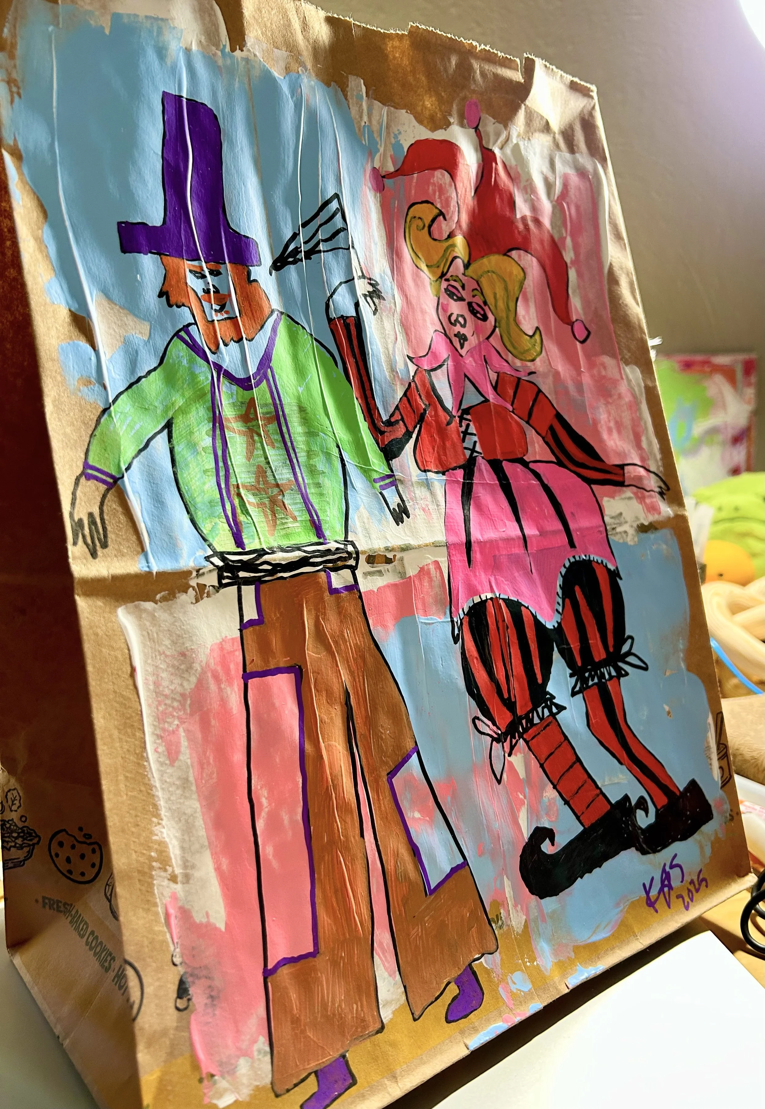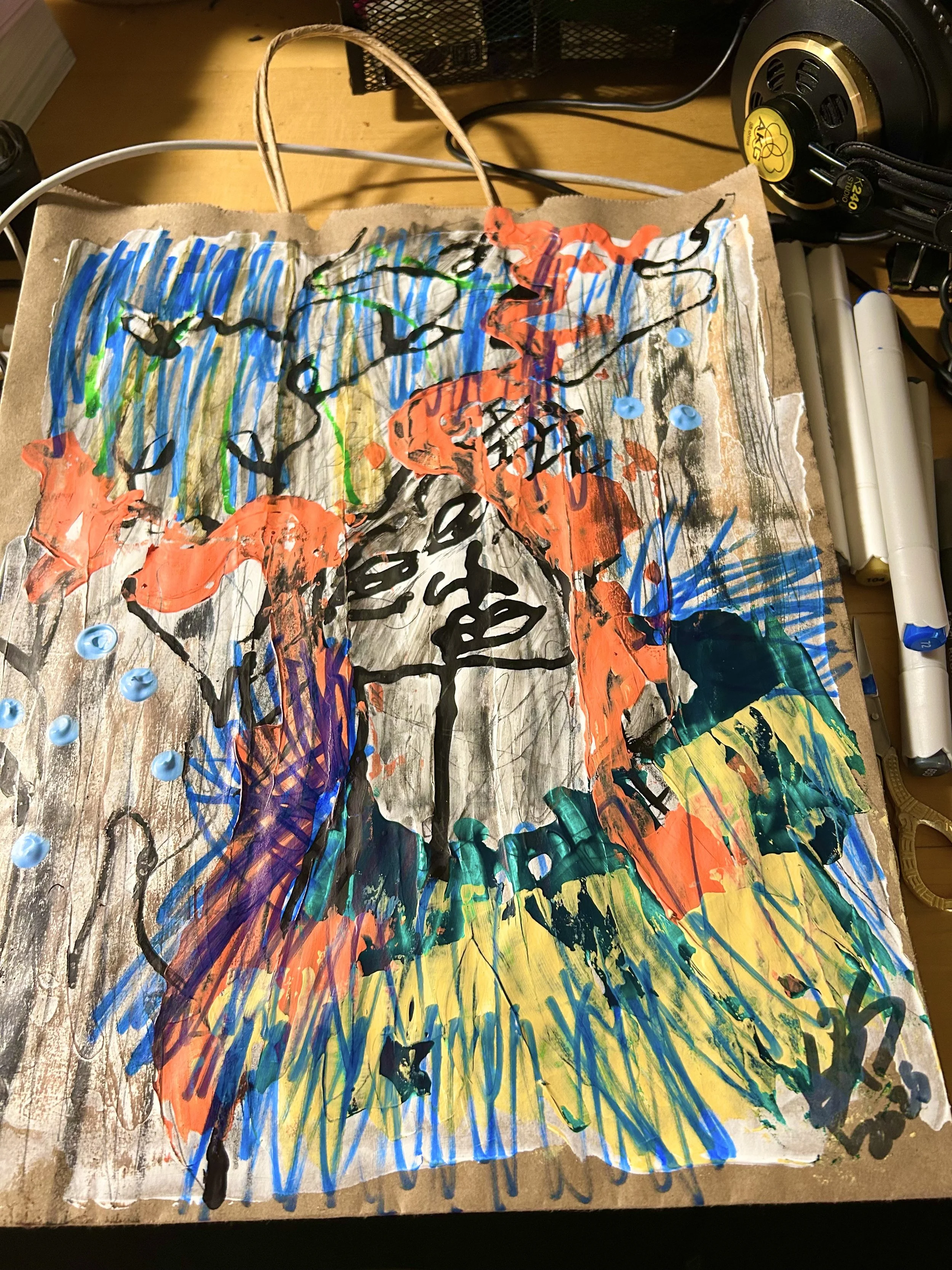 First, put down a layer of white acrylic paint or gesso. I don’t use gesso often because of the fumes. Me and my clan are all super sensitive to fumes! I always use acrylic paint instead, and it usually turns out ok. Then paint a background. And once that is dry, use paint markers, alcohol markers, sharpies, or gel crayons to draw on the bag! You can collage, or do anything you want to. If you will be gifting the bag, make sure you seal the artwork to preserve the beauty.